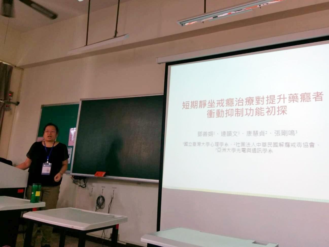 2018台灣心理學會第五十七屆年會於2018年10月13-14日於長榮大學舉辦,主題為【心理學的理論與應用Principles and implications of Psychology】。本協會與臺灣大學心理系連韻文副教授、亞洲大學光電與通訊學系張剛鳴副教授共同合作之藥癮治療實證研究,由臺灣大學心理學研究所博士候選人鄧善娟代表發表,論文主題為『短期靜坐戒癮治療對提升藥癮者衝動抑制功能初探』。